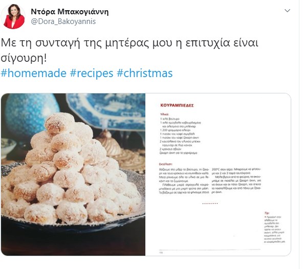 Η Ντόρα Μπακογιάννη, είναι στο πνεύμα των εορταστικών ημερών, και αποφάσισε να δημοσιεύσει και να μοιραστεί με τους φίλους της στα social media, τη συνταγή της μητέρας της για τους κουραμπιέδες. Είναι γνωστό άλλωστε ότι η Μαρίκα Μητσοτάκη ήταν εξαιρετική μαγείρισσα.