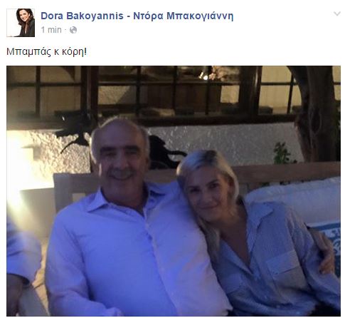 Την αποκάλυψη έκανε η Ντόρα Μπακογιάννη που φωτογράφισε μπαμπά και κόρη αγκαλιά και στη συνέχεια ανέβασε τη φωτογραφία στο λογαριασμό της στο facebook.