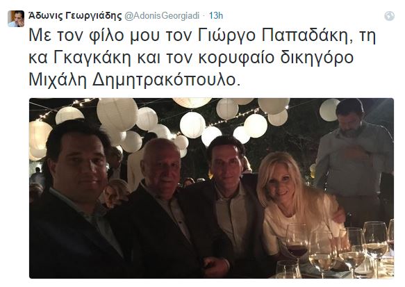 Ο κοινοβουλευτικός εκπρόσωπος της Νέας Δημοκρατίας και ο γνωστός δημοσιογράφος απόλαυσαν ένα καλοκαιρινό βράδυ παρέα με την Κατερίνα Γκαγκάκη και τον δικηγόρο, Μιχάλη Δημητρακόπουλο, όπως φαίνεται στη φωτογραφία που ανέβασε ο κ. Γεωργιάδης στον προσωπικό του λογαριασμό στο Twitter.