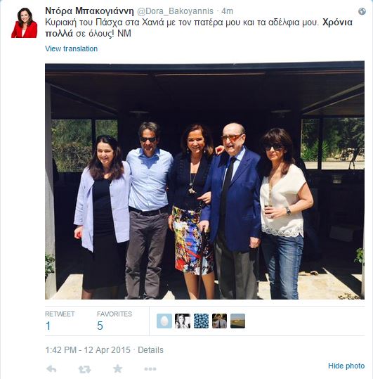 Η βουλευτής της Νέας Δημοκρατίας ανήρτησε μία φωτογραφία, γράφοντας: «Κυριακή του Πάσχα στα Χανιά με τον πατέρα μου και τα αδέλφια μου. Χρόνια πολλά σε όλους! ΝΜ».