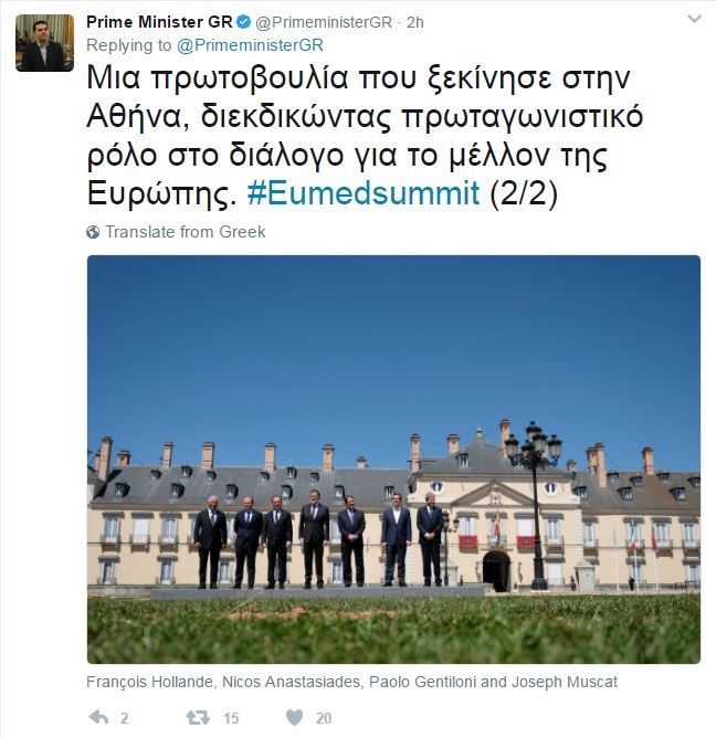 Σε εξέλιξη βρίσκονται οι εργασίες της Συνόδου των αρχηγών κρατών και κυβερνήσεων των Ευρωπαϊκών Χωρών του Νότου, την οποία συγκροτούν η Ελλάδα, Κύπρος, Ισπανία, Γαλλία, Ιταλία, Πορτογαλία, Μάλτα.Με ανάρτηση του στο Twitter, μετά την οικογενειακή φωτογραφία, ο Αλέξης Τσίπρας επισήμανε για τη Σύνοδο των Ευρωπαϊκών Χωρών του Νότου ότι πρόκειται για «μια πρωτοβουλία που ξεκίνησε στην Αθήνα, διεκδικώντας πρωταγωνιστικό ρόλο στον διάλογο για το μέλλον της Ευρώπης». Γενική θέση της Αθήνας είναι ότι αυτό το φόρουμ διαλόγου που ξεκίνησε με πρωτοβουλία του Έλληνα Πρωθυπουργού, πλέον καθιερώνεται και αποκτά μόνιμα χαρακτηριστικά, καθώς η σημερινή είναι η τρίτη κατά σειρά Σύνοδος και η τέταρτη ήδη έχει προγραμματιστεί να διεξαχθεί στη Λευκωσία.