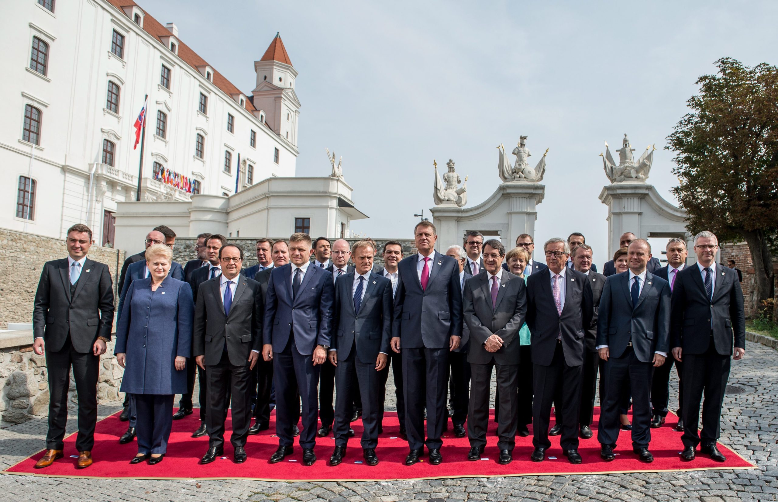 Με φόντο το κάστρο της Μπρατισλάβας έβγαλαν την καθιερωμένη οικογενειακή φωτογραφία οι 27 ηγέτες της ΕΕ που συμμετέχουν στην άτυπη Σύνοδο Κορυφής.