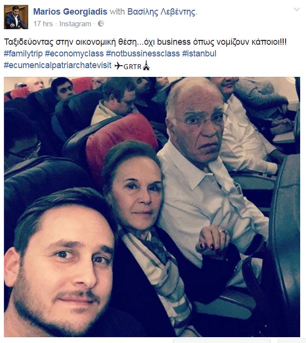 Ο βουλευτής της Ένωσης Κεντρώων Μάριος Γεωργιάδης ανέβασε στον λογαριασμό του στο Facebook μια selfie φωτογραφία μέσα από το αεροπλάνο. Δίπλα στον κ. Γεωργιάδη κάθονται ο Πρόεδρος της Ένωσης Κεντρώων Βασίλης Λεβέντης με τη σύζυγό του ενώ η οικογένεια ταξιδεύει προς την Κωνσταντινούπολη.