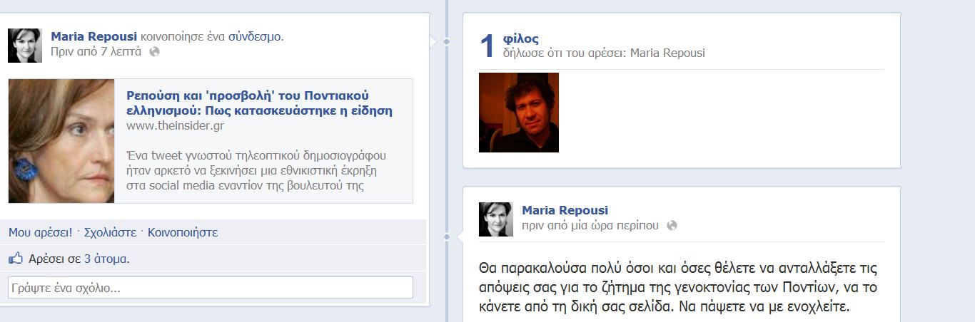 Μεγάλη συζήτηση άνοιξε στο Facebook με αφορμή την πληροφορία για την απουσία της Μαρίας Ρεπούση που αποχώρησε από την Αίθουσα της Ολομέλειας της Βουλής, όταν ο Βύρων Πολύδωρας ζήτησε να τηρηθεί ενός λεπτού σιγή στη μνήμη των θυμάτων της Γενοκτονίας των Ποντίων. Πολλοί χρήστες του facebook σχολίασαν την συγκεκριμένη πληροφορία με αποτέλεσμα να γράψει ένα κείμενο στην σελίδα της. ΔΕΙΤΕ ΤΙ ΕΓΡΑΨΕ