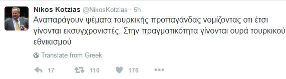 «Αναπαράγουν ψέματα τουρκικής προπαγάνδας νομίζοντας ότι έτσι γίνονται εκσυγχρονιστές. Στην πραγματικότητα γίνονται ουρά τουρκικού εθνικισμού» έγραψε στο μέσο κοινωνικής δικτύωσης ο κ. Κοτζιάς.