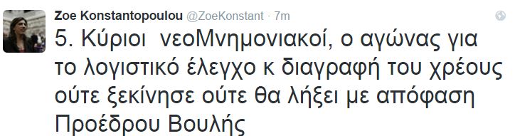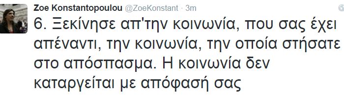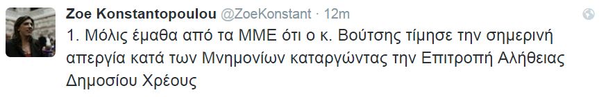 Οργισμένη απάντηση έδωσε η πρώην πρόεδρος της Βουλής, Ζωή Κωνσταντοπούλου στον Νίκο Βούτση, με αφορμή την απόφασή του για την λήξη των εργασιών της Επιτροπής Αλήθειας Δημοσίου Χρέους.