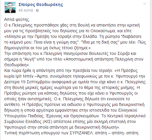 Συγκεκριμένα έγραψε: «Απλά ψεύτης. Ο κ. Πελεγρίνης προσπάθησε χθες στη Βουλή να απαντήσει στην κριτική μου για τις προσβλητικές του δηλώσεις για το Ολοκαύτωμα, και είπε: «Μίλησα με την Πρέσβη του Ισραήλ στην Ελλάδα. Τη ρώτησα “διαβάσατε το κείμενό μου; Ποια είναι η γνώμη σας”. “Ίδια με τη δική σας” μου λέει. Πώς δημιουργείται εκ του μη όντως τέτοιο ζήτημα;». Την απάντηση του κ. Πελεγρίνη πανηγύρισαν Βουλευτές του Σύριζα και σήμερα η “Αυγή” υπό τον τίτλο «Αποστομωτική απάντηση Πελεγρίνη στον Θεοδωράκη».