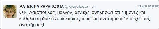 «Ο κ. Λαζόπουλος, μάλλον, δεν έχει αντιληφθεί ότι εμμονές και καθήλωση διακρίνουν κυρίως τους “μη αναπήρους” και όχι τους αναπήρους!», έγραψε στο Twitter η βουλευτής της ΝΔ.