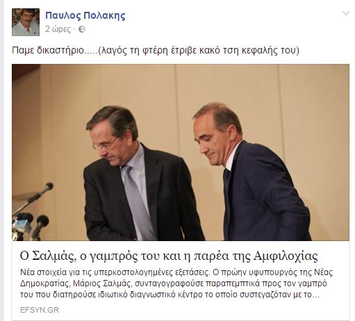 “Πάμε δικαστήριο…..(λαγός τη φτέρη έτριβε κακό τση κεφαλής του)” έγραψε στο Facebook, αναφερόμενος στη μήνυση που έχει καταθέσει εναντίον του ο κ. Σαλμάς.
