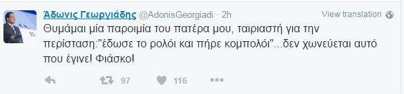 «Θυμάμαι μία παροιμία του πατέρα μου, ταιριαστή για την περίσταση: “έδωσε το ρολόι και πήρε κομπολόι”. Δεν χωνεύεται αυτό που έγινε. Φιάσκο», έγραψε στο Twitter ο Άδωνις Γεωργιάδης.
