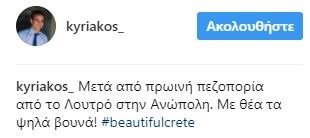“Μετά από πρωινή πεζοπορία από το Λουτρό στην Ανώπολη. Με θέα τα ψηλά βουνά! #beautifulcrete” έγραψε ο πρόεδρος της ΝΔ.