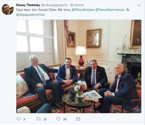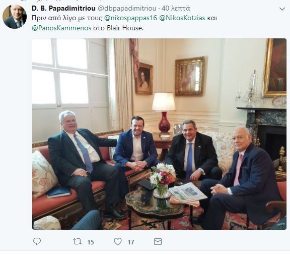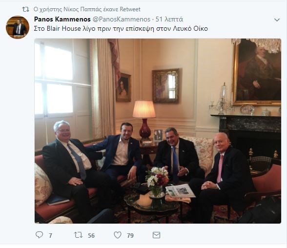 Μάλιστα, οι κύριοι Καμμένος, Παπαδημητρίου και Παππάς, ανέβασαν φωτογραφία στο twitter από το Blair House λίγο πριν από την επίσκεψη στον Λευκό Οίκο.