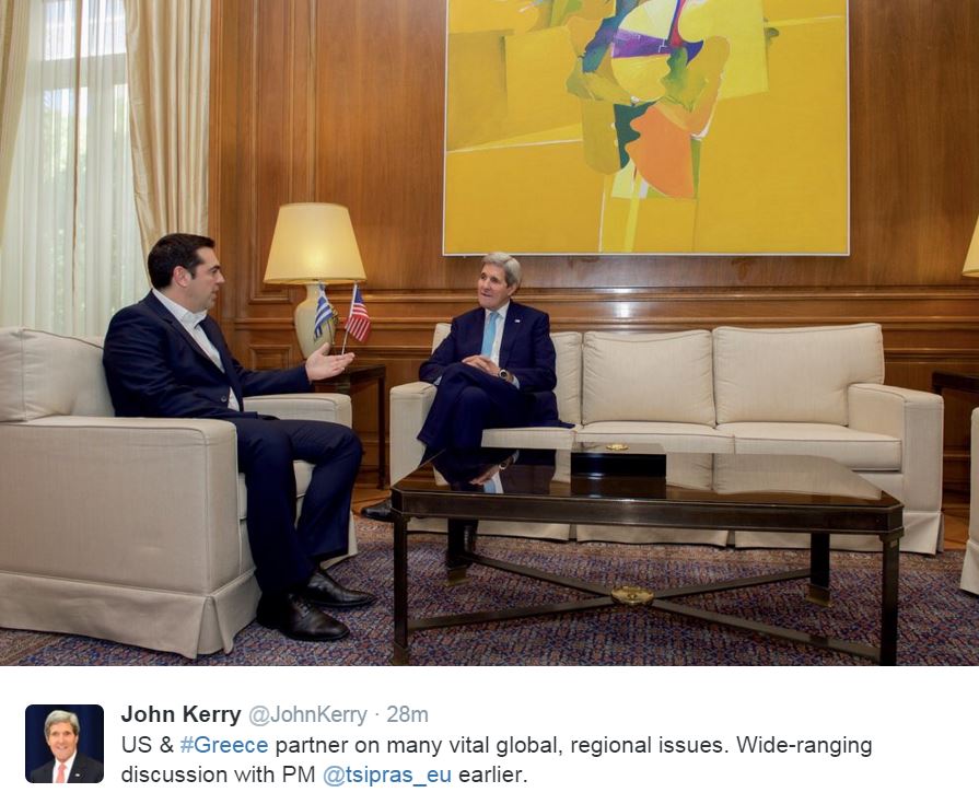 «Οι ΗΠΑ και η Ελλάδα είναι εταίροι σε πολλά παγκόσμια και περιφερειακά ζητήματα. Είχα μία ευρεία συζήτηση με τον Πρωθυπουργό, Αλέξη Τσίπρα νωρίτερα» έγραψε ο κ. Κέρι.