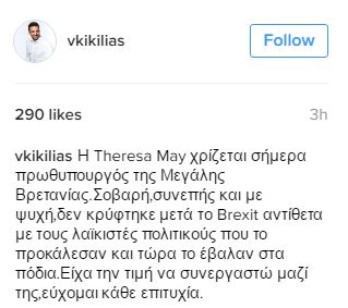 Ο κ. Κικίλιας έγραψε «Η Theresa May χρίζεται σήμερα πρωθυπουργός της Μεγάλης Βρετανίας. Σοβαρή, συνεπής και με ψυχή, δεν κρύφτηκε μετά το Brexit αντίθετα με τους λαϊκιστές πολιτικούς που το προκάλεσαν και τώρα το έβαλαν στα πόδια. Είχα την τιμή να συνεργαστώ μαζί της, εύχομαι κάθε επιτυχία».