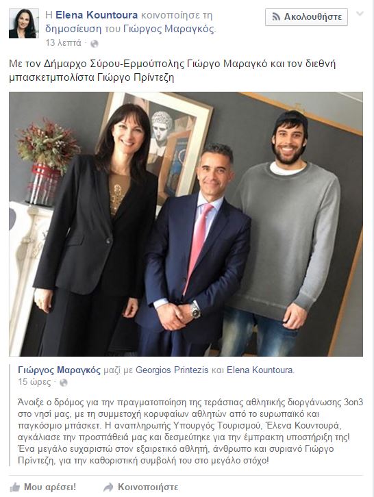 Φωτογραφία με τον διεθνή παίκτη της ομάδας μπάσκετ του Ολυμπιακού, Γιώργου Πρίντεζη και τον Δήμαρχο Σύρου-Ερμούπολης Γιώργο Μαραγκό, κοινοποίησε η αναπληρωτής Υπουργός Τουρισμού, Έλενα Κουντουρά, στον λογαριασμό της στο Facebook.