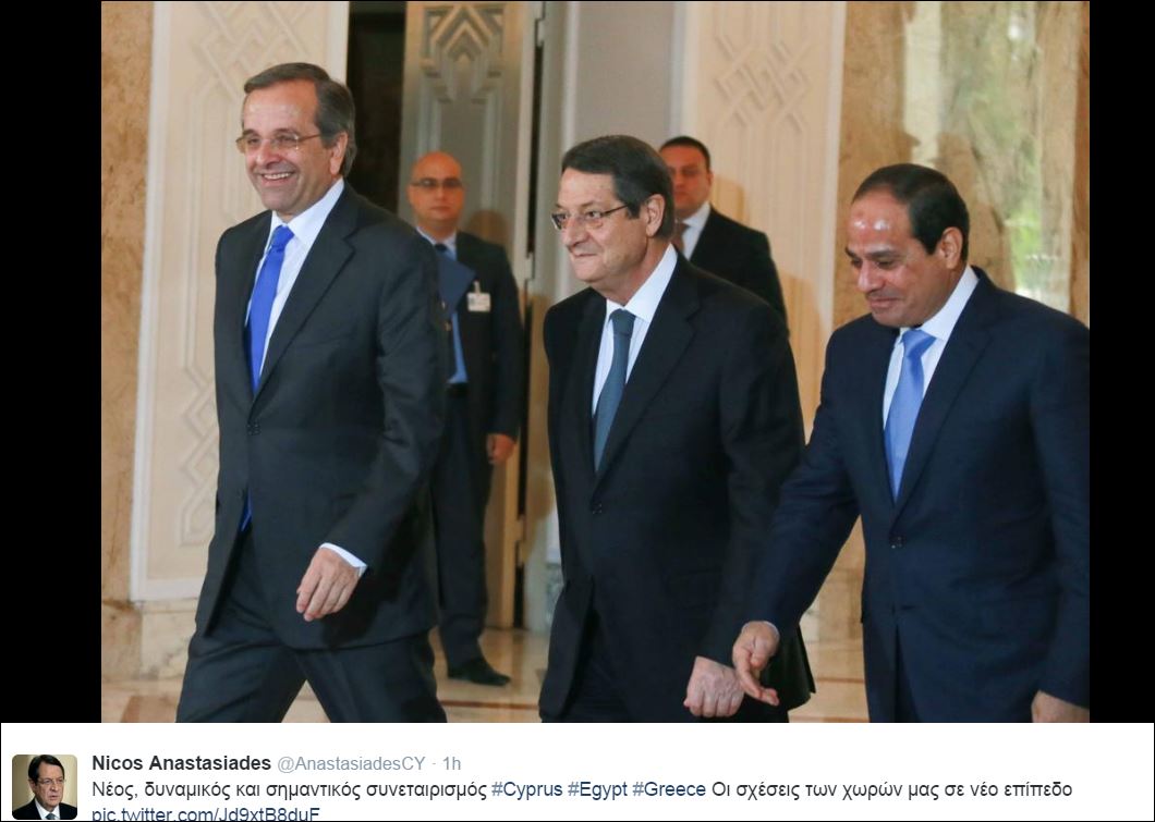 «Νέος, δυναμικός και σημαντικός συνεταιρισμός. Κύπρος, Αίγυπτος, Ελλάδα», έγραψε στο twitter ο Κύπριος Πρόεδρος, Νίκος Αναστασιάδης και ανέβασε μία φωτογραφία με τον Πρωθυπουργό, Αντώνη Σαμαρά και τον πρόεδρο της Αιγύπτου, Αμπντέλ Φατάχ αλ Σίσι.