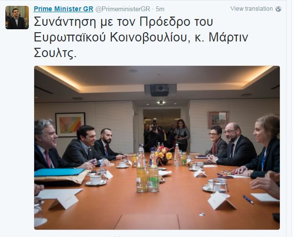 «Συνάντηση με τον Πρόεδρο του Ευρωπαϊκού Κοινοβουλίου, κ. Μάρτιν Σουλτς» αναφέρει ο κ. Τσίπρας.