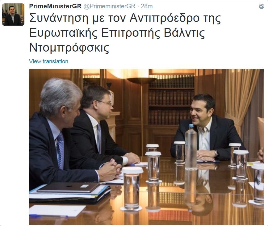 Μάλιστα ο Πρωθυπουργός ανέβασε στον λογαριασμό του στο twitter μία φωτογραφία του από τη συνομιλία του με τον κ. Ντομπρόβσκις.