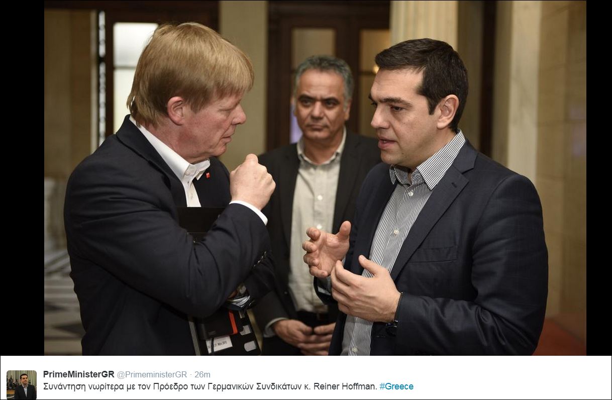 Μία φωτογραφία από τη συνάντησή του με τον Πρόεδρο της Συνομοσπονδίας Εργατικών Συνδικάτων της Γερμανίας (DGB) Ράινερ Χόφμαν, στο Μέγαρο Μαξίμου, ανέβαζε στο twitter ο Πρωθυπουργός, Αλέξης Τσίπρας.
