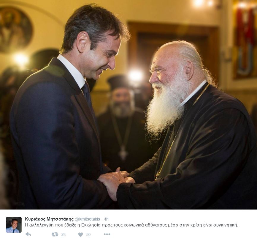 “Η αλληλεγγύη που έδειξε η Εκκλησία προς τους κοινωνικά αδύνατους μέσα στην κρίση είναι συγκινητική” έγραψε κ. Μητσοτάκης.