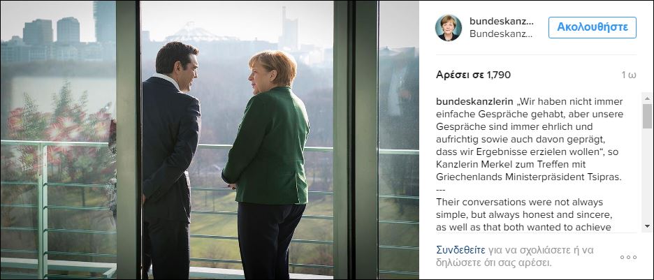 Μια φωτογραφία μετά από τη συνάντηση που είχε σήμερα με τον Αλέξη Τσίπρα, ανέβασε στο Instagram η Άνγκελα Μέρκελ.
