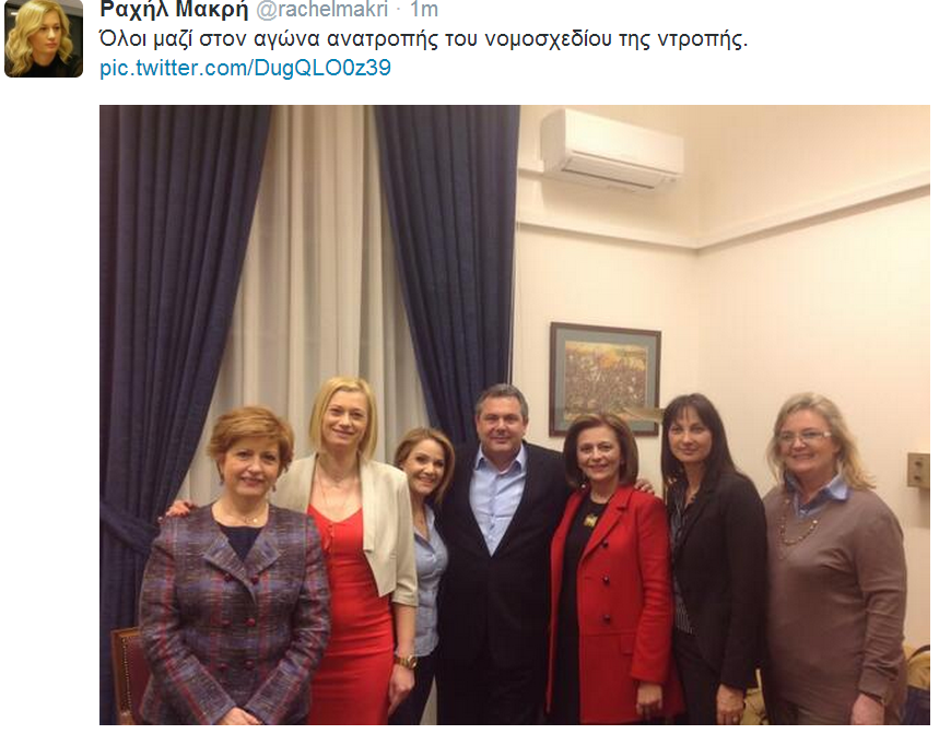 Αμέσως μετά την τελευταία παρέμβαση του Πάνου Καμμένου στη συζήτηση για το πολυνομοσχέδιο, βουλευτές των Ανεξάρτητων Ελλήνων φωτογραφήθηκαν στη Βουλή. Τη φωτογραφία, ανέβασε η Ραχήλ Μακρή στο twitter, σημειώνοντας: