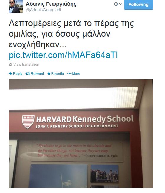 Στις Ηνωμένες Πολιτείες βρίσκεται ο υπουργός Υγείας Άδωνις Γεωργιάδης, ο οποίος θα παραστεί ως κεντρικός ομιλητής σε δύο ομιλίες στο Πανεπιστήμιο του Χάρβαρντ, μετά από πρόσκληση που του απηύθυνε η Ευρωπαϊκή Λέσχη του Harvard Kennedy School of Government. Ο κ. Γεωργιάδης ανέβασε φωτογραφία από το Χάρβαρντ στο Twitter με το ακόλουθο σχόλιο: «Λεπτομέρειες μετά το πέρας της ομιλίας, για όσους μάλλον ενοχλήθηκαν…».