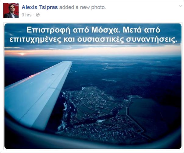 Με μία φωτογραφία στα μέσα κοινωνικής δικτύωσης, ο Πρωθυπουργός, Αλέξης Τσίπρας, σχολίασε την επιστροφή του από τη Ρωσία και τις επαφές που είχε εκεί.