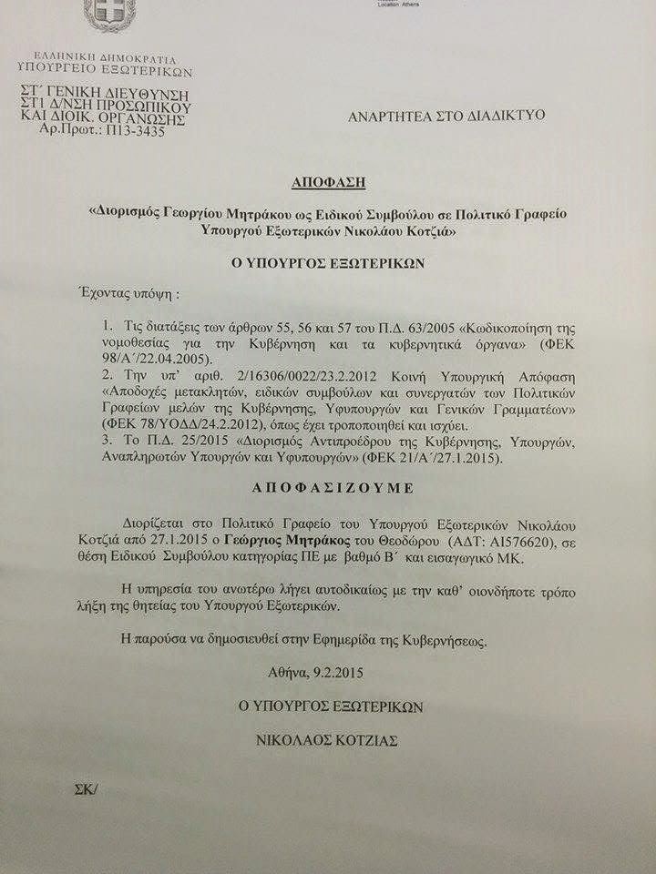 • Γεώργιος Θεοδώρου Μητράκος διορίστηκε στις 27/01/2015 στο ΥΠ.ΕΞ. (Ο κ. Κοτζιάς ορκίστηκε στις 6 το απόγευμα, άντε και με τα πόδια να του πάρει να πάει στο Υπουργείο Εξωτερικών μια ώρα,  υπέγραψε ΑΜΕΣΩΣ -μην χάσουμε κανένα μεροκάματο – τον διορισμό του Γεωργίου Θεοδώρου Μητράκου). https://diavgeia.gov.gr/luminapi/api/decisions/ΩΤΒΣΕ-ΕΟΒ/document