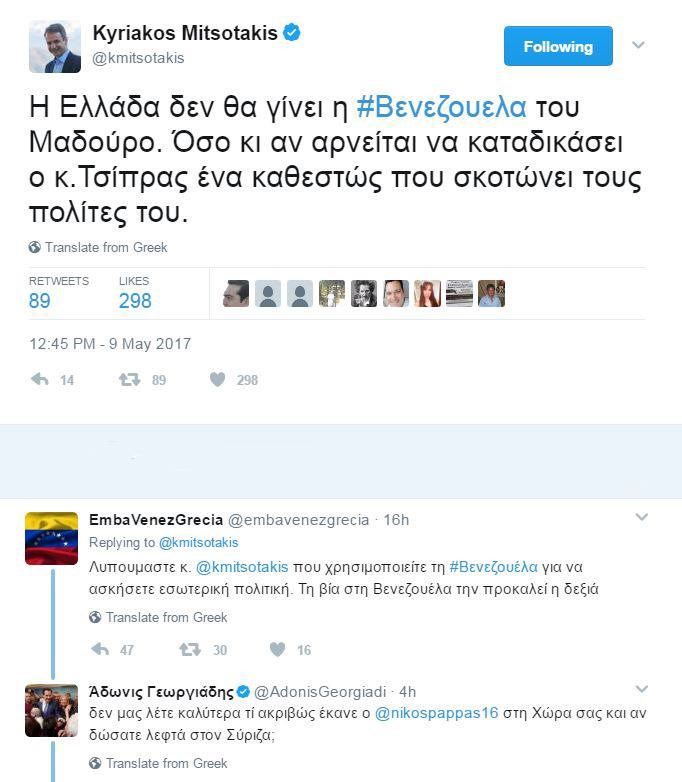 Ο αρχηγός της Αξιωματικής αντιπολίτευσης είχε γράψει: “Η Ελλάδα δεν θα γίνει Βενεζουέλα του Μαδούρο. Όσο κι αν αρνείται να καταδικάσει ο κ. Τσίπρας ένα καθεστώς που σκοτώνει τους πολίτες του”.