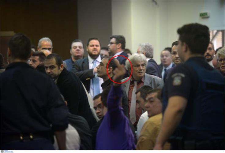 Όπως θα δείτε και στις φωτογραφίες ο άνδρας με το μωβ πουκάμισο ύψωσε το μεσαίο του δάχτυλο με αποτέλεσμα να προκληθεί ένταση. Σύμφωνα με την ιστοσελίδα goldendawnwatch.org, πρόκειται για τον κατηγορούμενο Γιάννη Καζαντζόγλου, φερόμενος ως συνοδηγός του Γιώργου Ρουπακιά το βράδυ της δολοφονίας του Παύλου Φύσσα. Ωστόσο, μέχρι στιγμής δεν υπάρχει κάποιο σχόλιο από την πολιτική αγωγή και την υπεράσπιση για το περιστατικό.