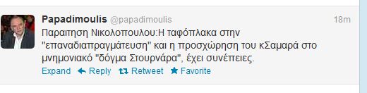 Την παραίτηση του Νίκου Νικολόπουλου από τη θέση του υφυπουργού Εργασίας σχολίασε στο Twitter ο βουλευτής του ΣΥΡΙΖΑ Δημήτρης Παπαδημούλης.”Παραιτηση Νικολόπουλου:Η ταφόπλακα στην “επαναδιαπραγμάτευση” και η προσχώρηση του κ. Σαμαρά στο μνημονιακό “δόγμα Στουρνάρα”, έχει συνέπειες”, γράφει ο κ. Παπαδημούλης.