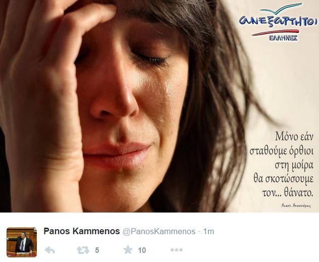 Μετά την ανακοίνωση της συμφωνίας της κυβέρνησης με τους δανειστές ο υπουργός Εθνικής Άμυνας και πρόεδρος των Ανεξαρτήτων Ελλήνων, Πάνος Καμμένος, έβαλε στον προσωπικό του λογαριασμό στο twitter μία φωτογραφία που απεικονίζει μία γυναίκα που κλαίει. Στην φωτογραφία αναγράφεται η εξής φράση: «Μόνο εάν σταθούμε όρθιοι στη μοίρα θα σκοτώσουμε τον… θάνατο».