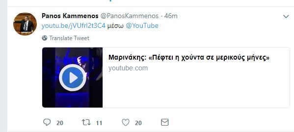 Μόλις έγινε γνωστή η απόφαση του βουλευτή, ο πρόεδρος των ΑΝΕΛ ανέβασε ένα tweet με ένα βίντεο υπό τον τίτλο “Μαρινάκης: Πέφτει η χούντα σε μερικούς μήνες”.
