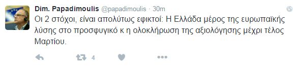 Την άποψη ότι οι δύο στόχοι της Ελλάδας για το προσφυγικό και την ολοκλήρωση της αξιολόγησης είναι εφικτοί εξέφρασε ο ευρωβουλευτής του ΣΥΡΙΖΑ και αντιπρόεδρος του ευρωπαϊκού κοινοβουλίου Δημήτρης Παπαδημούλης, με ανάρτηση που έκανε στο Twitter πριν από λίγα λεπτά.