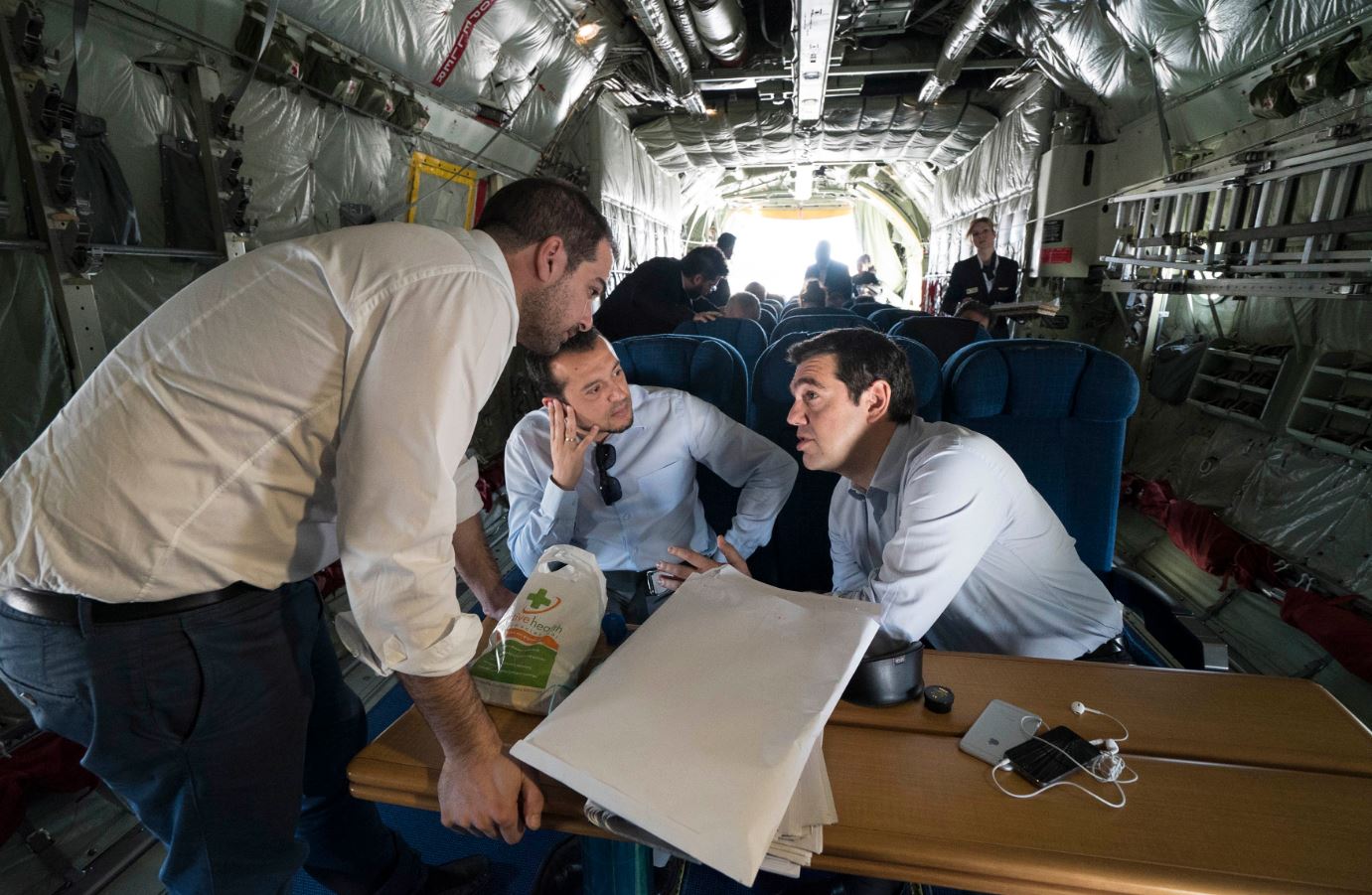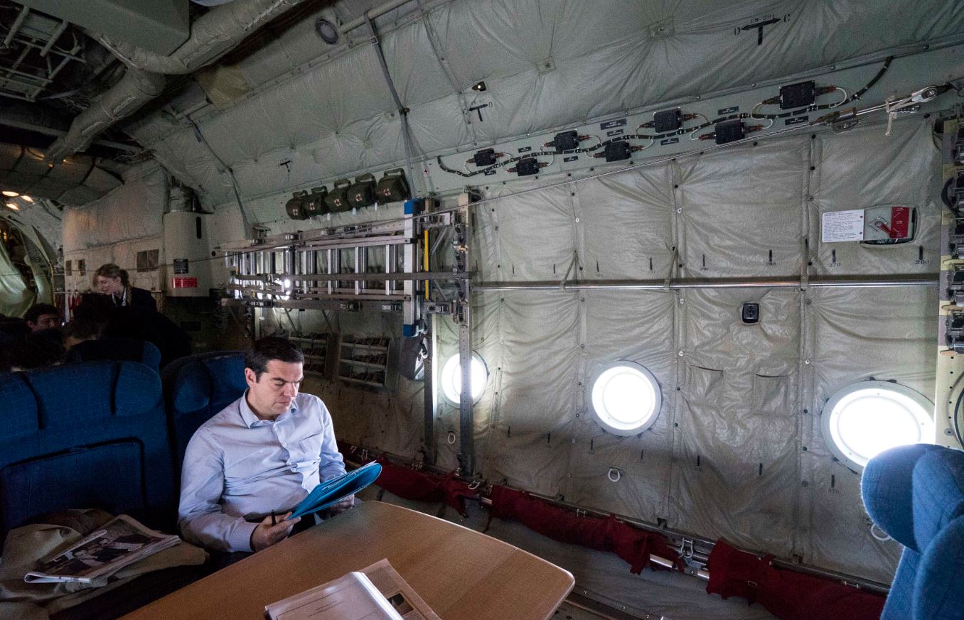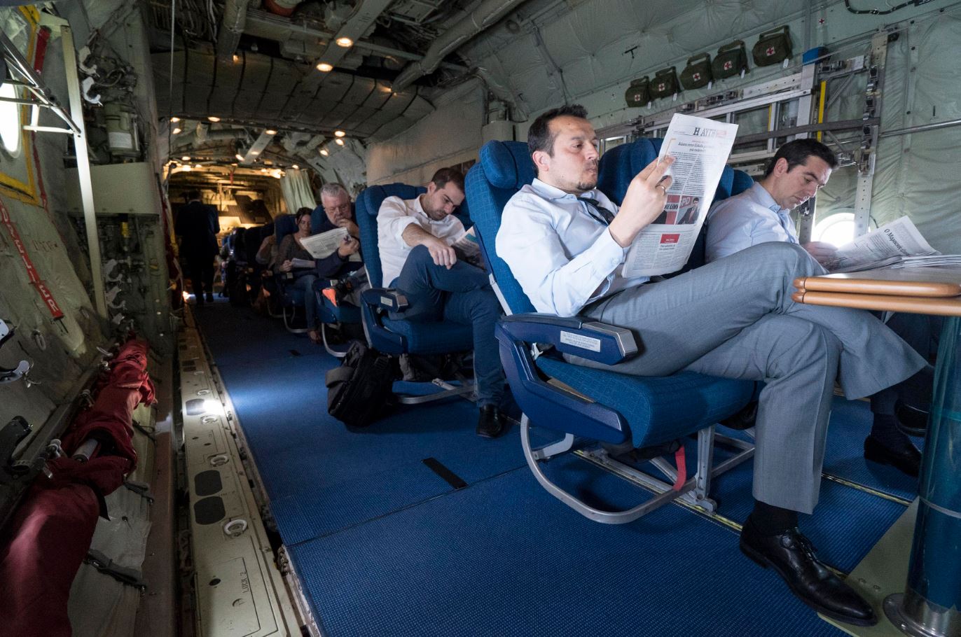 Ιδιαίτερα χαμογελαστός ήταν ο Πρωθυπουργός, Αλέξης Τσίπρας, κατά τη διάρκεια της πτήσης του με το C-130 για τη Ρίγα της Λετονίας, όπου συμμετέχει στις εργασίες της Συνόδου Κορυφής. Όπως φαίνεται και στις φωτογραφίες ο Αλέξης Τσίπρας, συνομιλούσε συνεχώς με τους συνεργάτες του, Νίκο Παππά, Ευκλείδη Τσακαλώτο και Γαβριήλ Σακελλαρίδη , ενώ παράλληλα διάβαζε εφημερίδες. Στη συνέχεια πήρε μπροστά του τον μπλε φάκελο, μελετώντας προσεχτικά τις σημειώσεις που βρίσκονταν μέσα σε αυτόν.