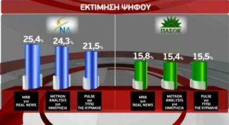 Το ρευστό πολιτικό κλίμα και η πτώση των δύο μεγάλων κομμάτων επιβεβαιώνεται σε τρεις νέες δημοσκοπήσεις. Σύμφωνα με την MRB για την Realnews η διαφορά της ΝΔ με το ΠΑΣΟΚ φτάνει στο 7,8%, η εταιρεία pulse για τον Ελεύθερο Τύπο της Κυριακής δίνει την διαφορά στο 6% και η Μέτρον Analysis για την Ημερησία στο 4,5%.