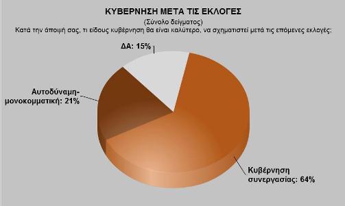 Οι ερωτηθέντες στην μέτρηση του Ελεύθερου Τύπου της Κυριακής επιθυμούν σε ποσοστό 64% κυβέρνηση συνεργασίας, ενώ το 21% θέλει αυτοδύναμη κυβέρνηση.