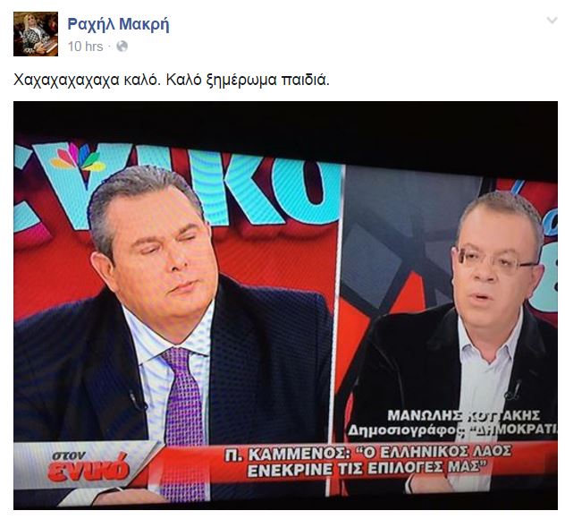Ένα καρέ από την εκπομπή “στον ενικό” με καλεσμένο τον υπουργό Εθνικής Άμυνας και πρόεδρο των Ανεξαρτήτων Ελλήνων, Πάνο Καμμένο, σχολίασε με ανάρτησή της στο Facebook η Ραχήλ Μακρή.