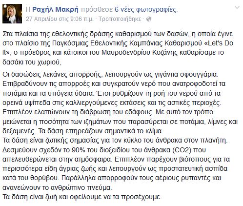 Με ένα «αξεσουάρ» που δεν την έχουμε ξαναδεί εμφανίστηκε στις φωτογραφίες που ανήρτησε στον προσωπικό της λογαριασμό στο Facebook, η βουλευτής του ΣΥΡΙΖΑ, Ραχήλ Μακρή. Η κυρία Μακρή έλαβε μέρος στην εθελοντική δράση καθαρισμού των δασών της Κοζάνης και συγκεκριμένα στο Μαυροδένδρι Κοζάνης, κρατώντας μία γκλίτσα και φορώντας γάντια. Δείτε τις φωτογραφίες και το κείμενο που ανήρτησε στον λογαριασμό της.