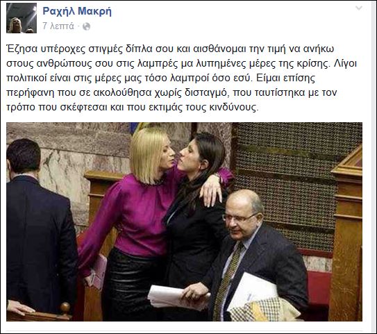 «Έζησα υπέροχες στιγμές δίπλα σου και αισθάνομαι την τιμή να ανήκω στους ανθρώπους σου στις λαμπρές μα λυπημένες μέρες της κρίσης. Λίγοι πολιτικοί είναι στις μέρες μας τόσο λαμπροί όσο εσύ. Είμαι επίσης περήφανη που σε ακολούθησα χωρίς δισταγμό, που ταυτίστηκα με τον τρόπο που σκέφτεσαι και που εκτιμάς τους κινδύνους», ήταν το σχόλιο της κ. Μακρή, το οποίο συνοδεύεται από μια παλαιότερη φωτογραφία που η ίδια αγκαλιάζει την Πρόεδρο της Βουλής.