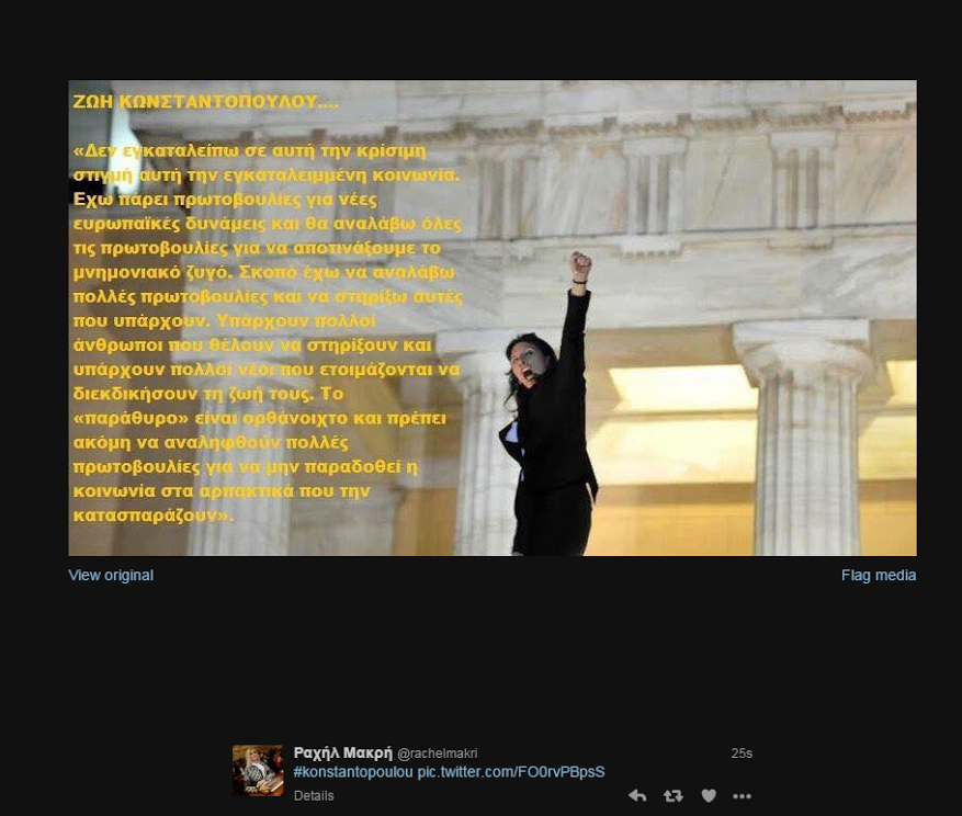Τη χαρακτηριστική φωτογραφία της Ζωής Κωνσταντοπούλου, στην οποία υψώνει τη γροθιά της έξω από τη Βουλή, ανέβασε η Ραχήλ Μακρή στον προσωπικό της λογαριασμό στο twitter.