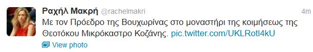 «Με τον Πρόεδρο της Βουχωρίνας στο μοναστήρι της κοιμήσεως της Θεοτόκου Μικρόκαστρο Κοζάνης», έγραψε νωρίτερα στο twitter η βουλευτής των Ανεξάρτητων Ελλήνων Ραχήλ Μακρή αναφερόμενη στη φωτογραφία που ανέβασε.