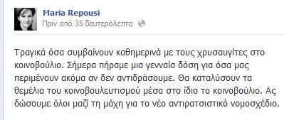 Τα πρωτοφανή γεγονότα που εκτυλίχθηκαν σήμερα στο Κοινοβούλιο σχολίασε η Μαρία Ρεπούση μέσω του Facebook.