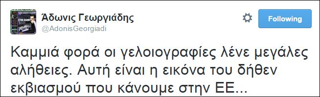 “Αυτή είναι η εικόνα του δήθεν εκβιασμού που κάνουμε στην ΕΕ…” έγραψε στο λογαριασμό του στο twitter ο κοινοβουλευτικός εκπρόσωπος της ΝΔ Άδωνις Γεωργιάδης αναρτώντας παράλληλα το παρακάτω σκίτσο.