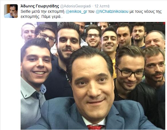 Μία σέλφι με τους νεαρούς καλεσμένους της χθεσινής εκπομπής του Νίκου Χατζηνικολάου «στον ενικό», όπου ήταν καλεσμένος, ανέβασε στον προσωπικό του λογαριασμό στο Twitter ο Άδωνις Γεωργιάδης.