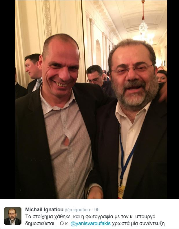 Ο λόγος για τον ανταποκριτή του MEGA στην Ουάσινγκτον, Μιχάλη Ιγνατίου, που ανέβασε στον προσωπικό του λογαριασμό στο twitter μία φωτογραφία με τον κ. Βαρουφάκη και έγραψε: