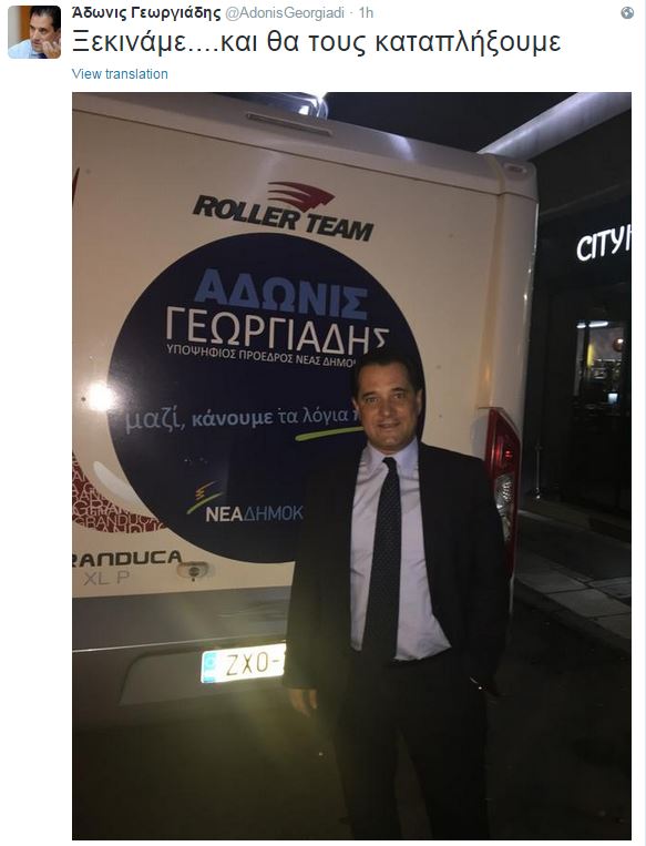 Ποζάροντας δίπλα σ��ο λεωφορείο με το οποίο θα πραγματοποιήσει προεκλογικές περιοδείες, ο υποψήφιος πρόεδρος της Νέας Δημοκρατίας, Άδωνις Γεωργιάδης, καλημέρισε τους ακόλουθούς του στο twitter.