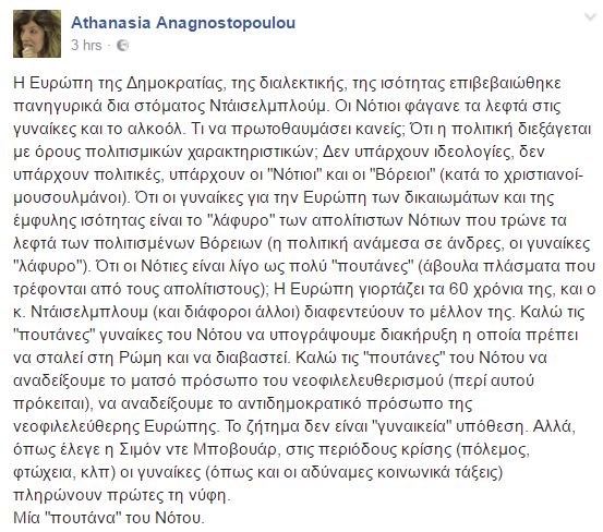 Με μια αιχμηρή ανάρτηση στον λογαριασμό της στο Facebook, η βουλευτής του ΣΥΡΙΖΑ και πρώην υπουργός Σία Αναγνωστοπούλου απάντα στον επικεφαλής του Eurogroup Γερούν Ντάισελμπλουμ για τη δήλωσή του ότι οι χώρες του Νότου ξόδεψαν όλα τα λεφτά τους σε ποτά και γυναίκες.«Η Ευρώπη της Δημοκρατίας, της διαλεκτικής, της ισότητας επιβεβαιώθηκε πανηγυρικά δια στόματος Ντάισελμπλούμ. Οι Νότιοι φάγανε τα λεφτά στις γυναίκες και το αλκοόλ. Τι να πρωτοθαυμάσει κανείς; Ότι η πολιτική διεξάγεται με όρους πολιτισμικών χαρακτηριστικών; Δεν υπάρχουν ιδεολογίες, δεν υπάρχουν πολιτικές, υπάρχουν οι “Νότιοι” και οι “Βόρειοι” (κατά το χριστιανοί-μουσουλμάνοι). Ότι οι γυναίκες για την Ευρώπη των δικαιωμάτων και της έμφυλης ισότητας είναι το “λάφυρο” των απολίτιστων Νότιων που τρώνε τα λεφτά των πολιτισμένων Βόρειων (η πολιτική ανάμεσα σε άνδρες, οι γυναίκες “λάφυρο”). Ότι οι Νότιες είναι λίγο ως πολύ “πουτάνες” (άβουλα πλάσματα που τρέφονται από τους απολίτιστους); Η Ευρώπη γιορτάζει τα 60 χρόνια της, και ο κ. Ντάισελμπλουμ (και διάφοροι άλλοι) διαφεντεύουν το μέλλον της» σημειώνει η κ. Αναγνωστοπούλου.«Καλώ τις “πουτάνες” γυναίκες του Νότου να υπογράψουμε διακήρυξη η οποία πρέπει να σταλεί στη Ρώμη και να διαβαστεί. Καλώ τις “πουτάνες” του Νότου να αναδείξουμε το ματσό πρόσωπο του νεοφιλελευθερισμού (περί αυτού πρόκειται), να αναδείξουμε το αντιδημοκρατικό πρόσωπο της νεοφιλελεύθερης Ευρώπης. Το ζήτημα δεν είναι “γυναικεία” υπόθεση. Αλλά, όπως έλεγε η Σιμόν ντε Μποβουάρ, στις περιόδους κρίσης (πόλεμος, φτώχεια, κλπ) οι γυναίκες (όπως και οι αδύναμες κοινωνικά τάξεις) πληρώνουν πρώτες τη νύφη» προσθέτει η κ. Αναγνωστοπούλου η οποία υπογράφει στο τέλος ως «”πουτάνα” του Νότου».