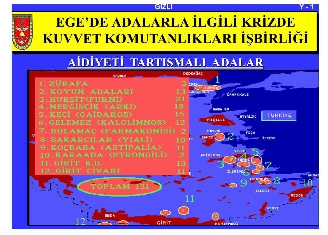 Σύμφωνα με το ντοκουμέντο που επικαλείται η Nordic Monitor, τα «αμφισβητούμενα» κατά την Τουρκία νησιά, νησίδες και βραχονησίδες αφορούν: